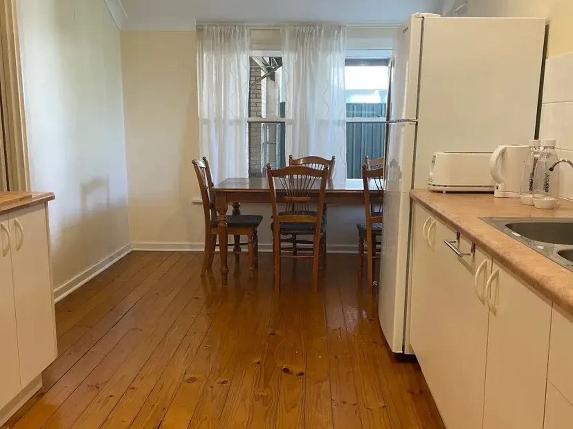The kitchen has ample cupboard space and a gas cook top. The adjacent dining has gorgeous windows looking out into the rear garden.