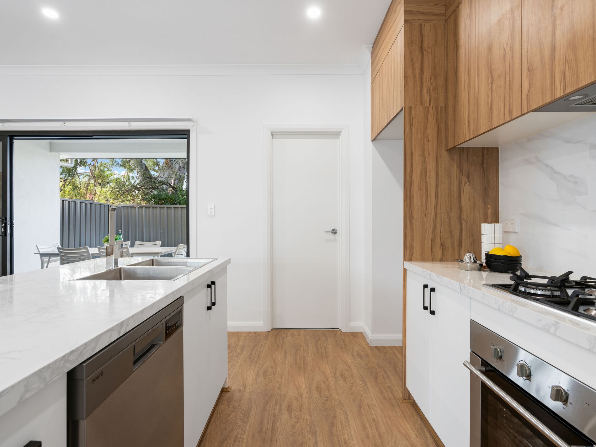 The modern kitchen is the heart of the home, complete with sleek stainless steel appliances, a dishwasher, and elegant stone benchtops.