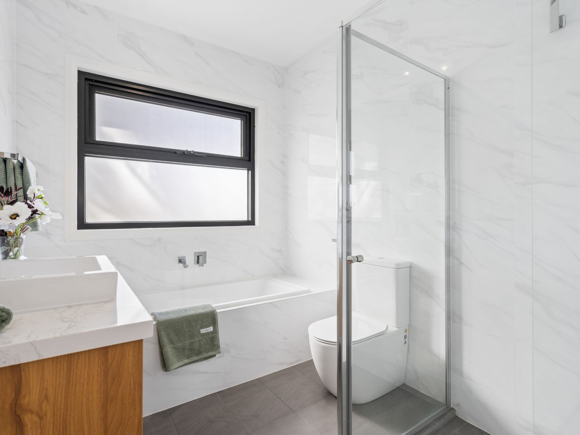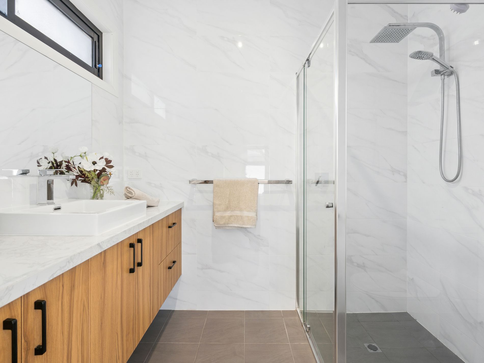 The main suite features a stylish ensuite with floor-to-ceiling tiling and built-in robes.